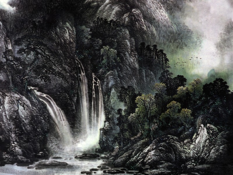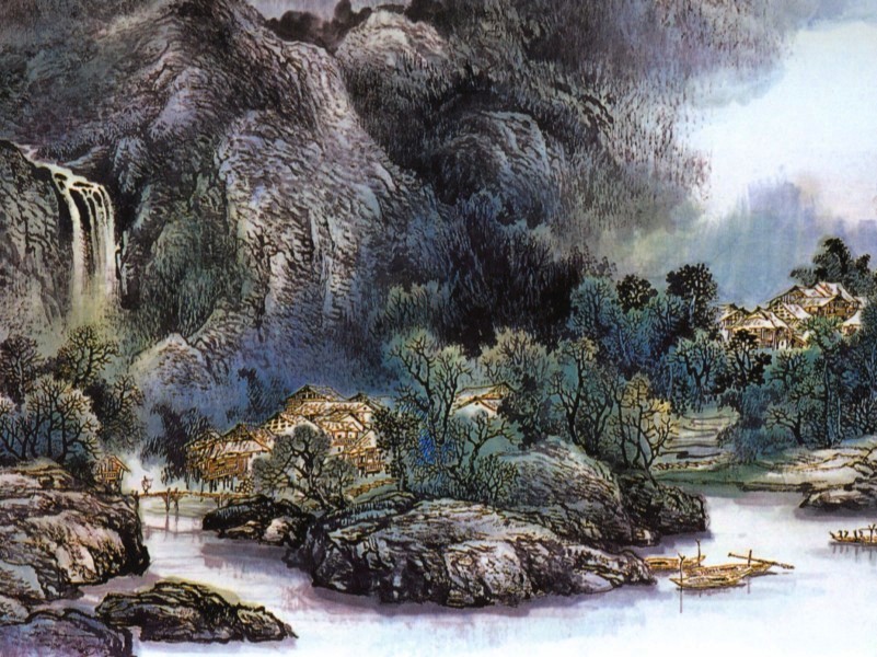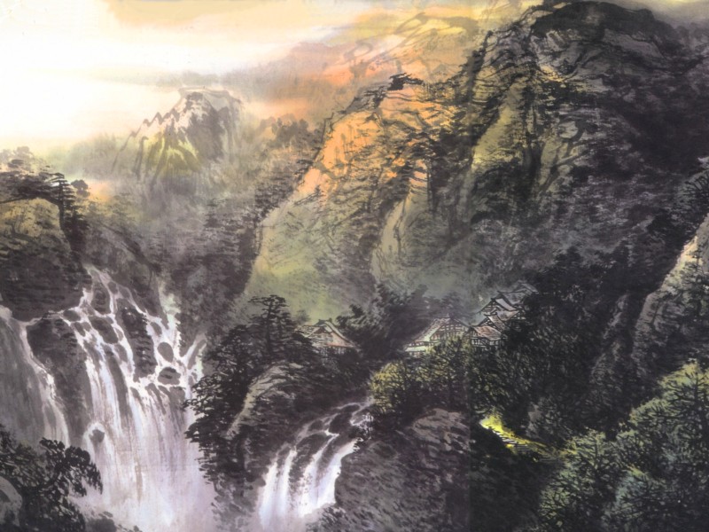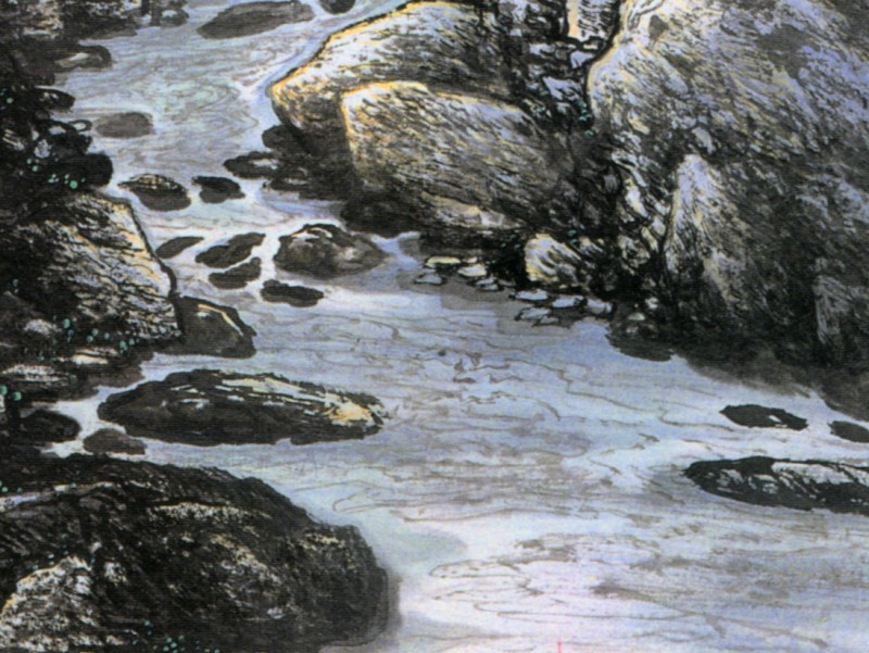 a scroll for easy transport. Landscape paintings can be quite large. A standard "small" size is 69x69 cm. Other typical sizes are 98x198, 132x240, and 136x68. The painting "Seeing Mountains in Dream" is a series of panels; the full size is 945x180 cm (31'x5'10"). Many of the images on this webpage have been cropped severely in order to fit them into a "thumbnail" format. Artists featured on this webpage: Ding Jianghong Cai Yinlong |