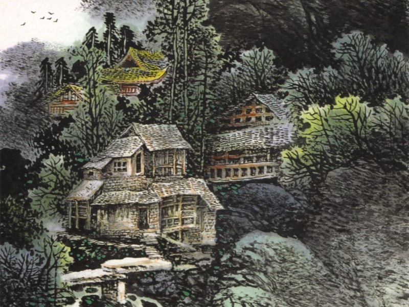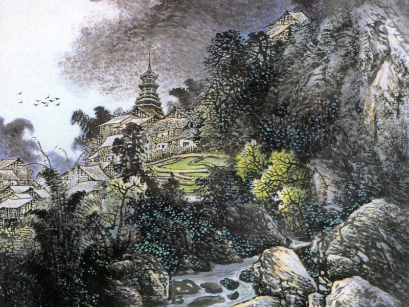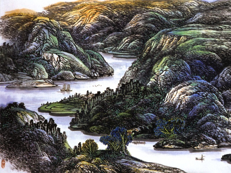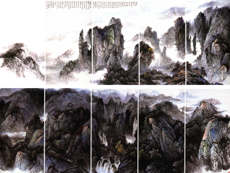 a scroll for easy transport. Landscape paintings can be quite large. A standard "small" size is 69x69 cm. Other typical sizes are 98x198, 132x240, and 136x68. The painting "Seeing Mountains in Dream" is a series of panels; the full size is 945x180 cm (31'x5'10"). Many of the images on this webpage have been cropped severely in order to fit them into a "thumbnail" format. Artists featured on this webpage: Ding Jianghong Cai Yinlong |